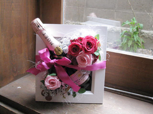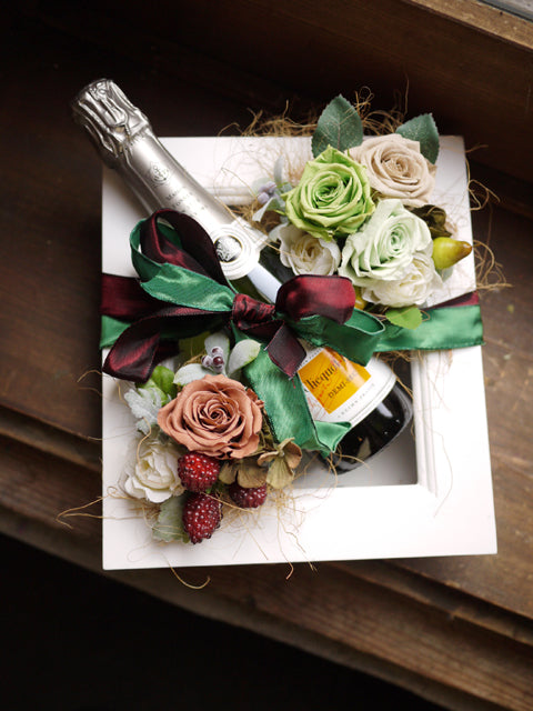 ヴーヴクリコやモエ、ドンペリなど銘柄ワインとプリザーブドフラワーを一緒に額フレームにアレンジしたグレースマーケットの額縁アレンジは結婚祝い、還暦祝い、新築祝いなど様々なお祝いに最適なプレゼントです。