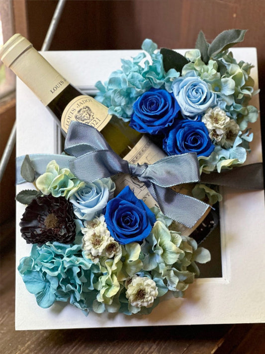 フランス白ワインとプリザーブドフラワーの額縁アレンジ (ブルー)