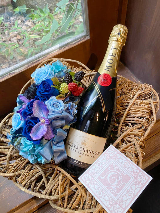 就任祝い 会社設立祝い[法人祝いにおすすめフラワーギフト]シャンパンモエ フルボトルとプリザーブドフラワーのセット(ブルー)