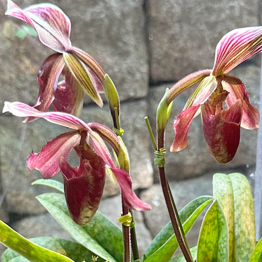 開店祝い、開院祝いに!パフィオ蘭三本立ち(高台鉢)