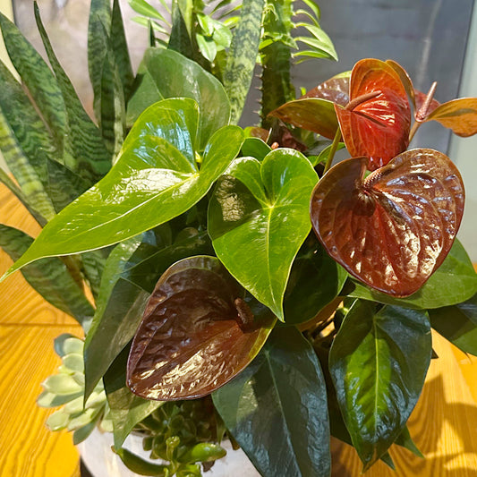 新築お祝い、開店祝いに!アンスリウムと多肉植物、サンスベリアの寄せ植え