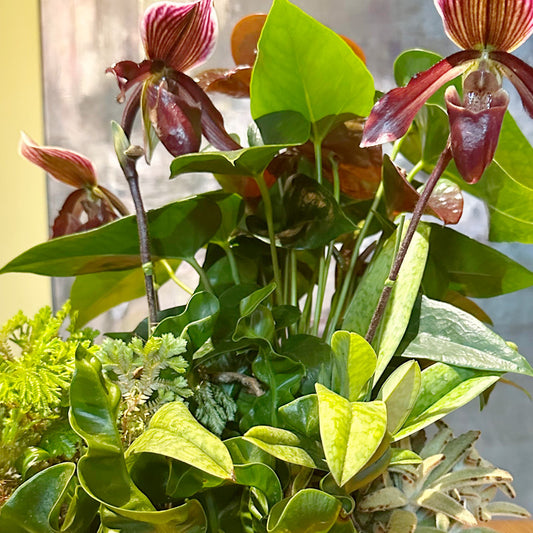 開店祝い、新築お祝いに!ブラック赤系アンスリウム、パフィオ蘭の寄せ植え 陶器鉢