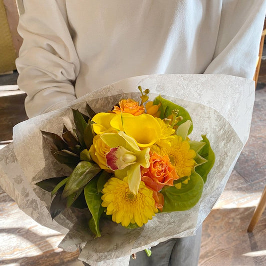 送別会 誕生日におすすめ!黄色オレンジ系生花ブーケ