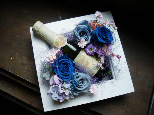 内祝い 結婚祝い 誕生日祝い[ワイン 花 ギフト]スパークリングワイン(ミニボトル)とプリザの額縁アレンジ(ブルー)