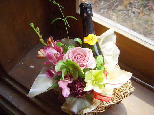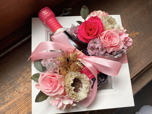 誕生日プレゼント[生花ギフト]スパークリングワインとピンクカラーのアレンジメント