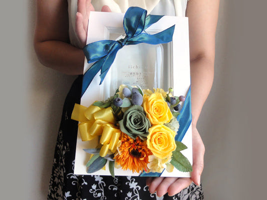 敬老の日 誕生日プレゼント 内祝い[花ギフト]焼酎(いいちこ)とプリザーブドフラワーの額縁アレンジ
