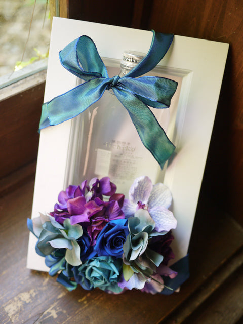 敬老の日 男性へお酒のプレゼント[青い花 ギフト]焼酎(いいちこ)とプリザーブドフラワーの額縁アレンジ