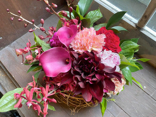 母の日 コンサート差し入れ 誕生日プレゼントに!季節のお花とカーネーションアレンジ(ピンクレッド)