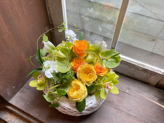 誕プレにおすすめ!鮮やかなイエローオレンジカラーのアレンジメント
