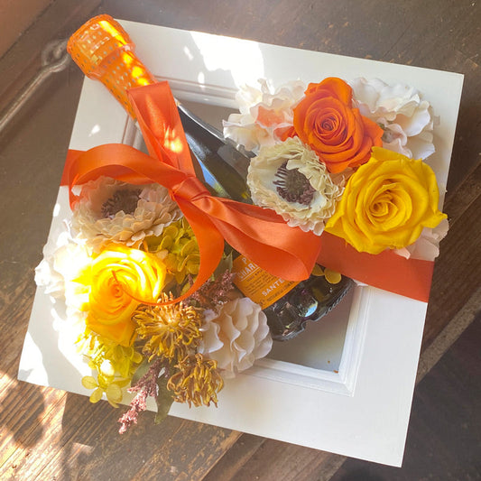 結婚祝い 二次会プレゼント 誕生日御祝い ピノ シャルドネ スプマンテ ロゼ ピッコロサイズとプリザーブドフラワーの額縁アレンジ