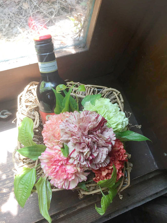 カーネーションと赤ワインの組み合わせは、母の日ギフトの定番フラワーセットです。遠く離れて暮らすお母さんにも、心を込めてお届けします。