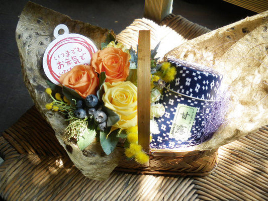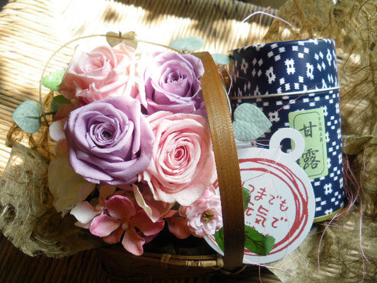 古希祝い 誕生日プレゼント[花 酒ギフト]日本酒久保田とプリザーブドフラワーの和風籠セット