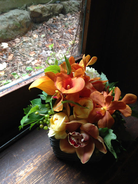 誕生日 送別プレゼント[5千円アレンジ] オレンジカラーとランのアレンジフラワー