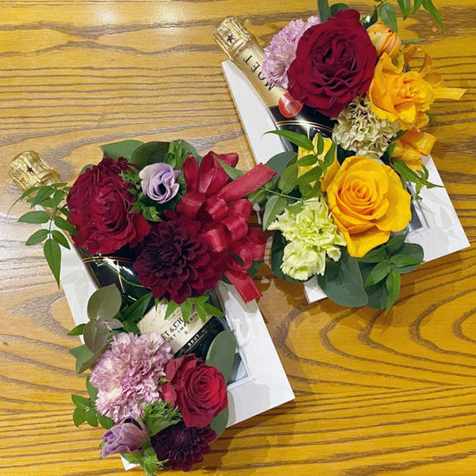 シャンパンモエ ハーフボトルと生花の額縁アレンジ(レッド)