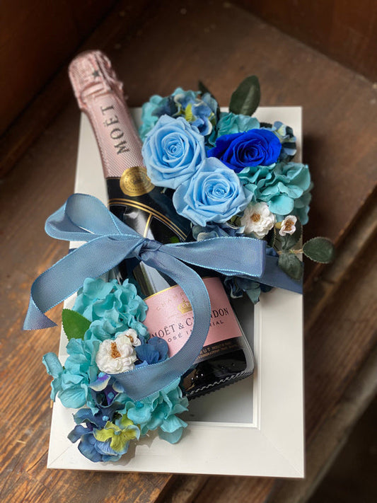 二次会プレゼント 結婚祝い[ワイン 花 ギフト]シャンパン(モエ ロゼ ハーフボトル)とプリザーブドの額縁アレンジ(ブルー)