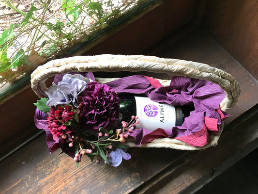紫色 古希祝いプレゼント[ワインギフト]神聖な木という名前のチリ産赤ワインとコサージュのセット
