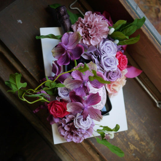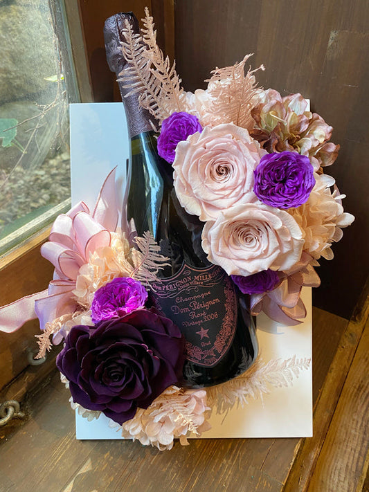 古希祝い 開業祝い 結婚祝い[ドンペリロゼ 花ギフト]ピンドンとプリザーブドフラワーの額縁アレンジ(パープル ローズ)