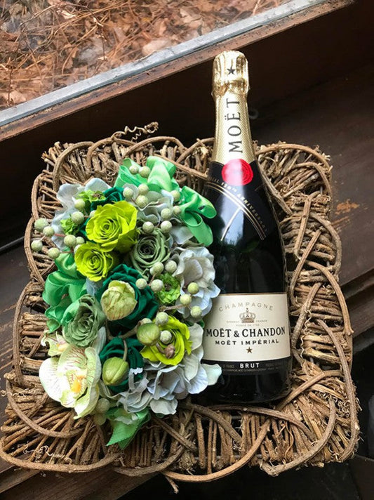 会社設立や送別に送りたい![シャンパンギフト]モエ フルボトルとプリザーブドフラワーのセット(グリーン)