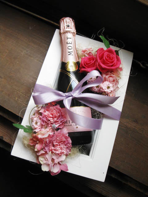 シャンパン(モエ)とプリザーブドの額縁アレンジ(ピンク)ミニボトル ¥11,000