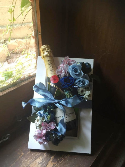 就任祝い、受賞祝い、開店祝いに!シャンパンモエ フルボトルとプリザーブドフラワーの額縁アレンジ(ブルー)