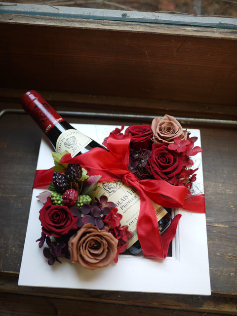 大人っぽい色のフラワーアレンジメントと一緒に贈るのはラベルにバラが描かれたワイン。もらって嬉しいオシャレなお酒ギフトを贈りませんか? 販売価格:¥13,200(税込) |