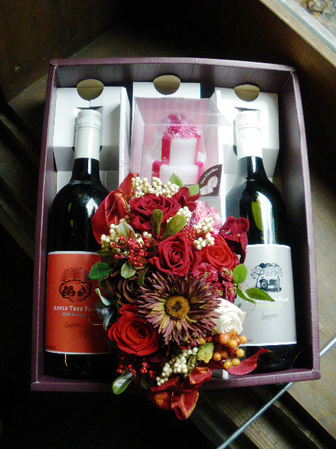 誕生日祝い[ワイン 花 ギフト]赤ワイン2本+ケーキ型キャンドル+プリザのセット
