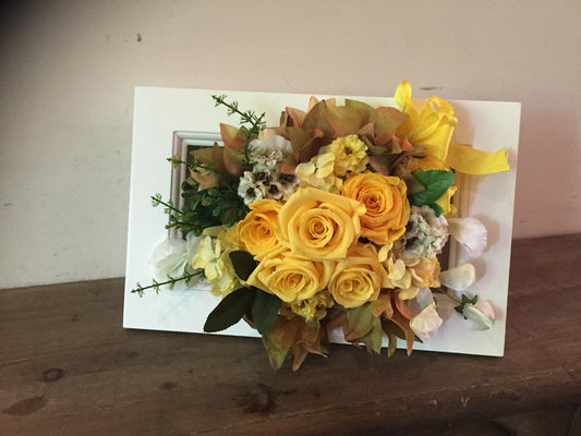 結婚祝い 二次会 開店祝いにオススメ![花プレゼント]プリザーブドフラワーの白額縁アレンジ イエロー