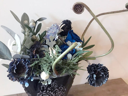 新築祝い インテリア[枯れないお花 プレゼント]造花とプリザーブドフラワーのアレンジ( ゼンマイ)ブルー