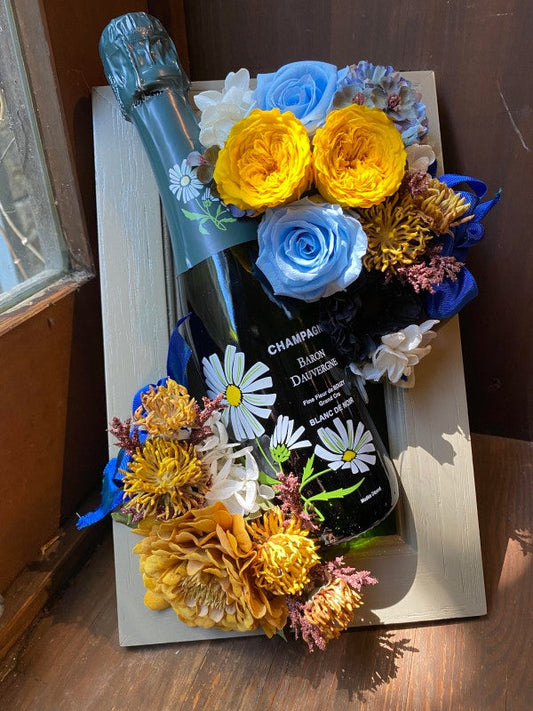 結婚祝い 還暦祝い 誕生日祝い【シャンパン 花 ギフト】フィーヌフルール ハーフボトルの額縁アレンジ(ブルー)
