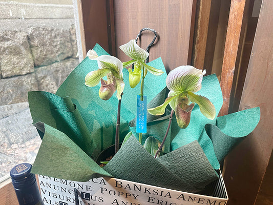 パフィオ蘭三本立ちと南アフリカの動物の可愛いラベルの紅白ワインセット