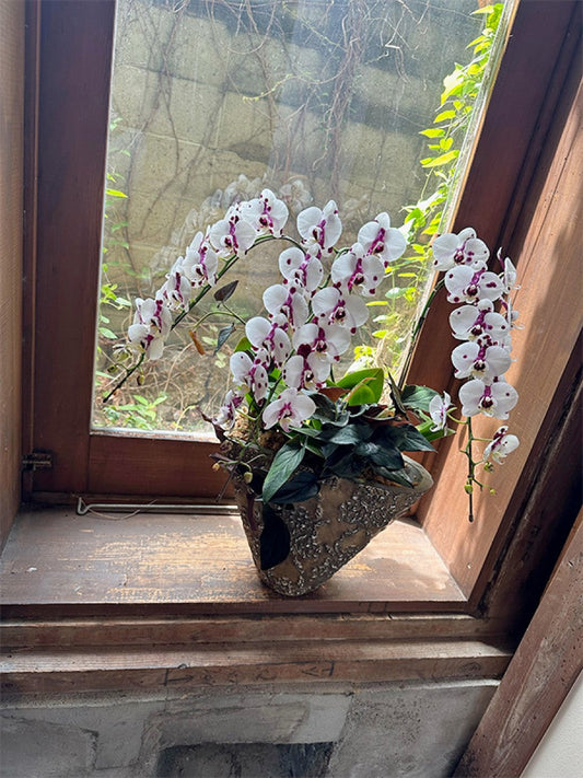 パンダのような模様の胡蝶蘭とシンゴニュームの寄せ植え ゴールド鉢