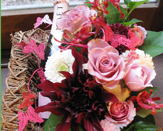 珍しい赤ワインのスパークリングに合わせた赤い花のアレンジです。 セットの天使のロッソはカシスソーダのように甘い味わいで、 渋みもないので普段赤ワインを飲まない方にもオススメ!