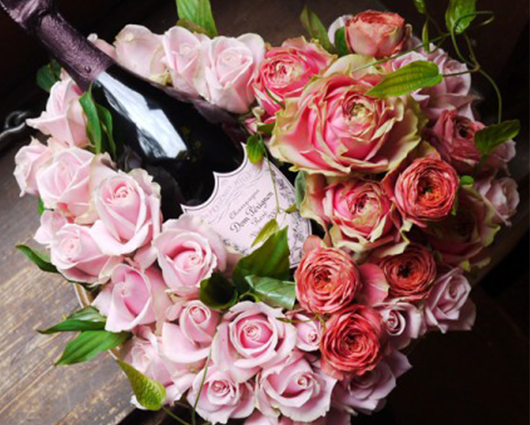 ドンペリ ロゼをゴージャスな生花のバラでハート形にアレンジしています。 その他でもグレースマーケットでは、お花とワイン・シャンパンのセットを多数ご用意しております!