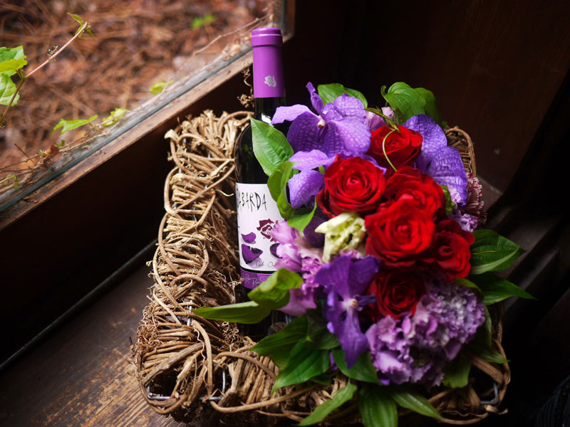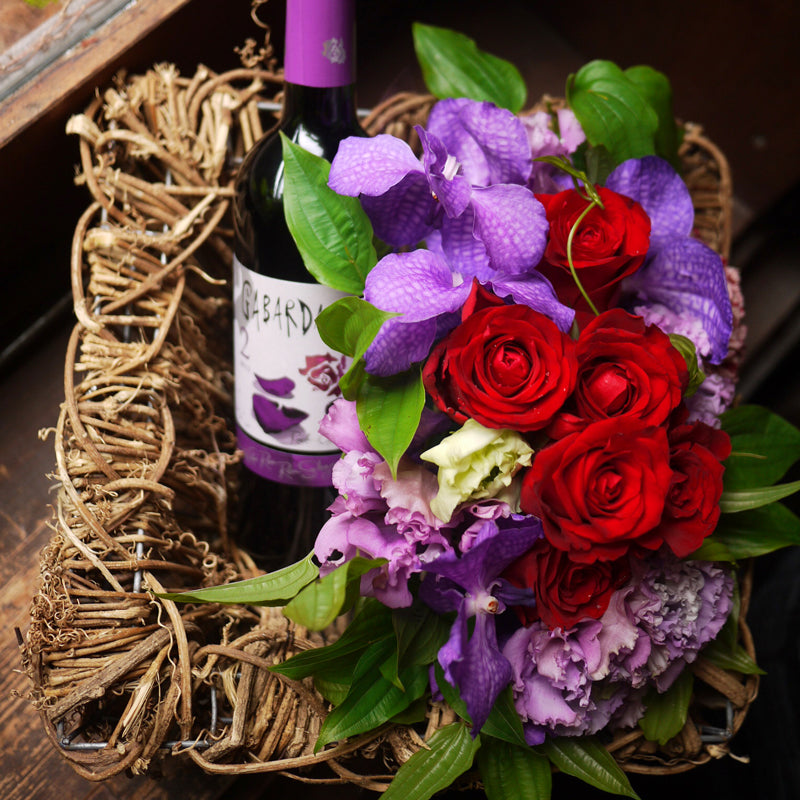 スペイン産の赤ワイン ガバルタ ドスのラベルに合わせて、紫色と赤色のお花をアレンジしました。