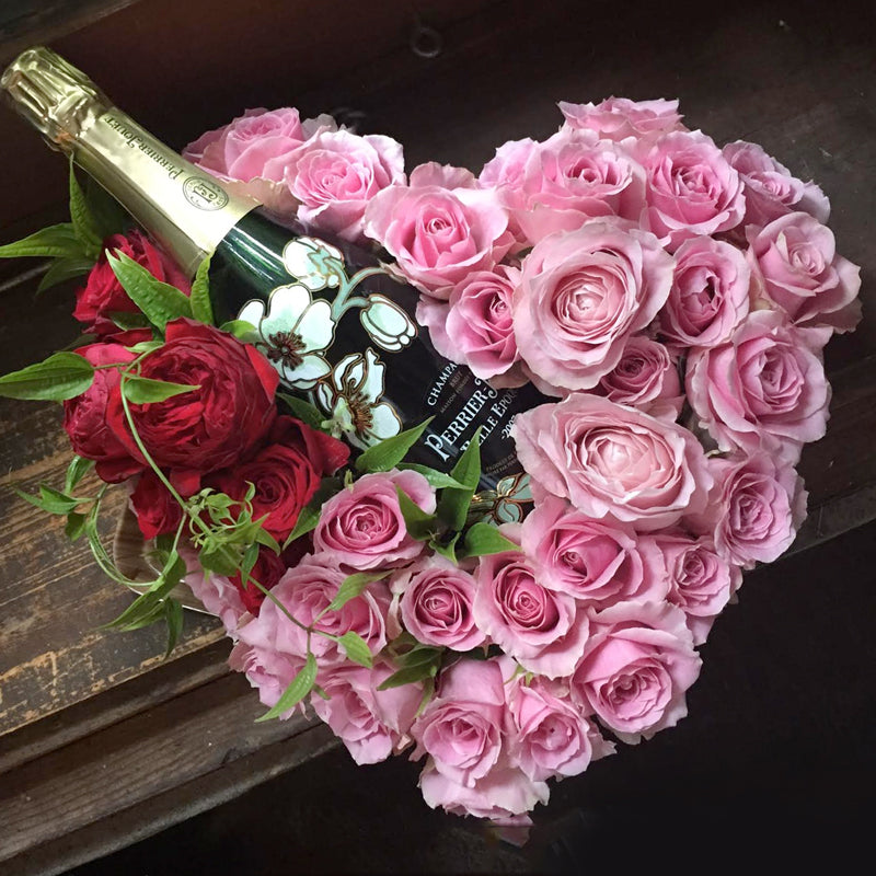 シャンパンが好きな方に贈りたい!美味しい銘柄シャンパンとゴージャスな生花のハート形アレンジメントです。美しいバラをたくさん使っています。ペリエ ジュエはシャンパーニュを代表する銘柄シャンパン。ボトルも美しく、もらって嬉しいプレゼントです。結婚祝いや記念日のプレゼント、開業祝いなどにおすすめです!