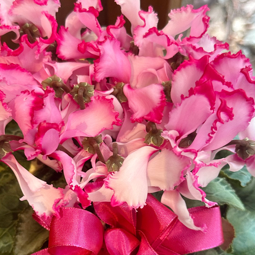 季節のギフト、贈答品に最適な豪華なシクラメンです。フリルの花びらが美しい素敵な品種で、5寸鉢です。カゴに入れてお届けいたします。