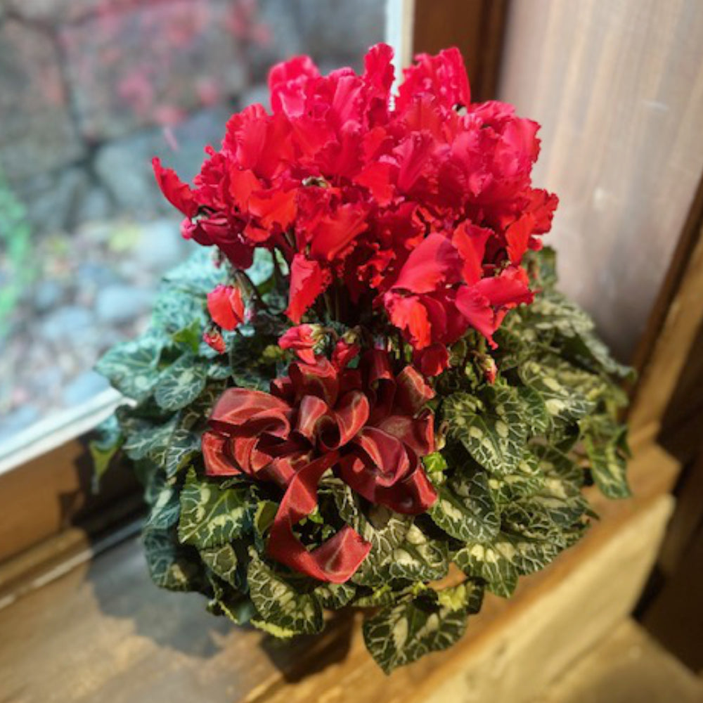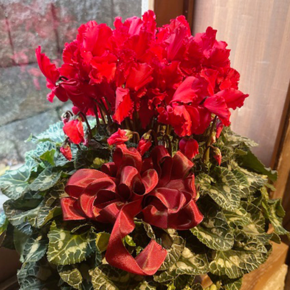 季節のギフト、贈答品に最適な豪華なシクラメンです。カーリーブライトスカーレットという、素敵な品種で、7寸鉢で立派です。